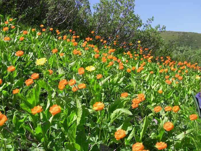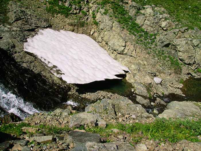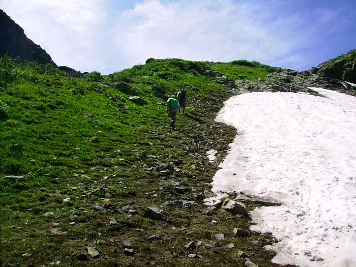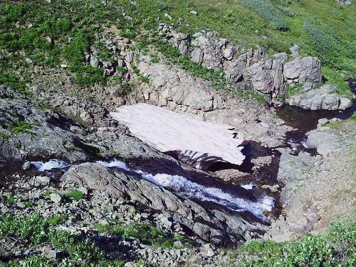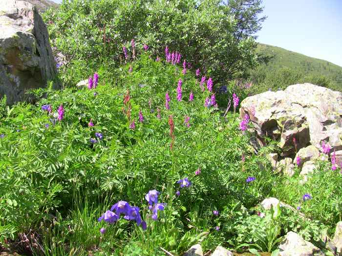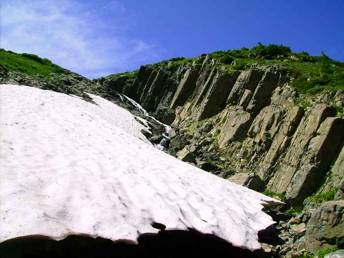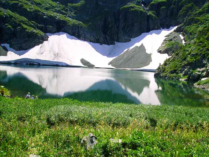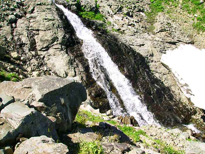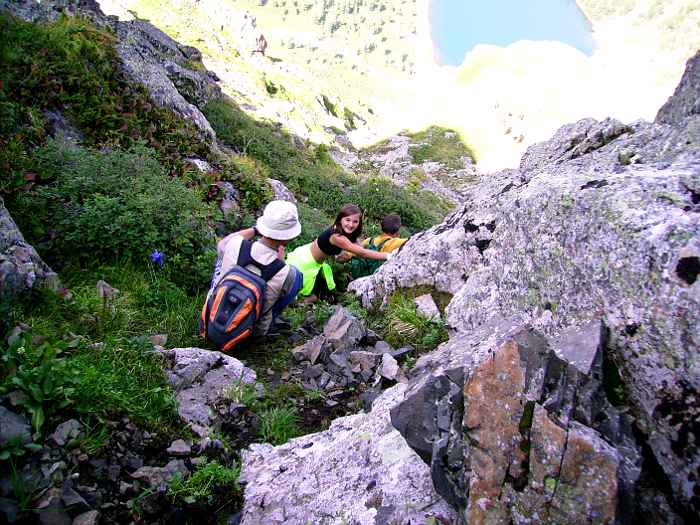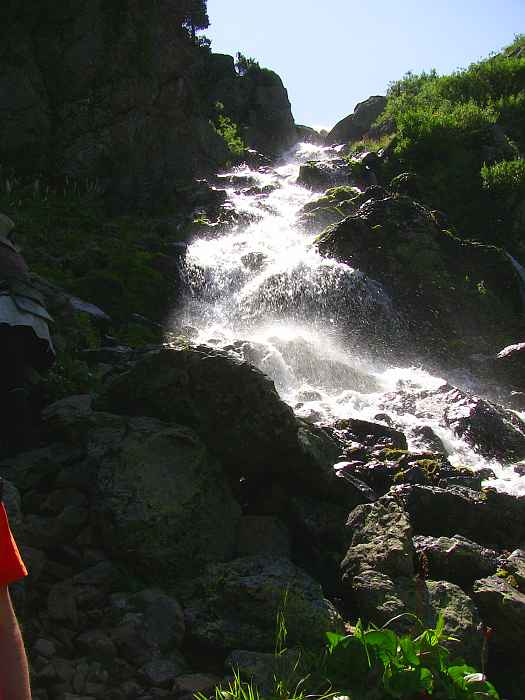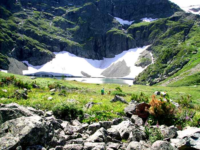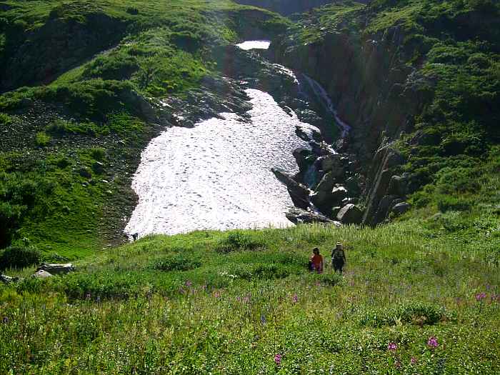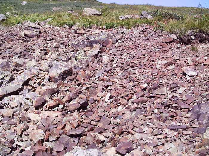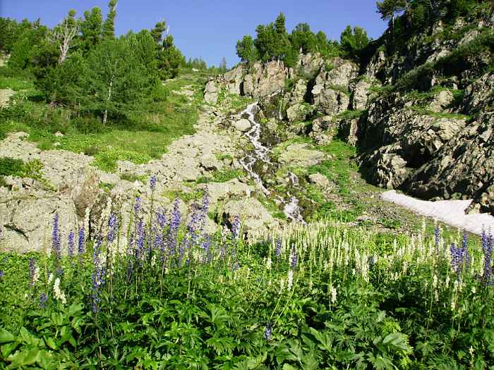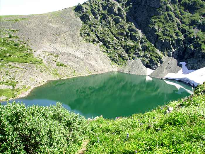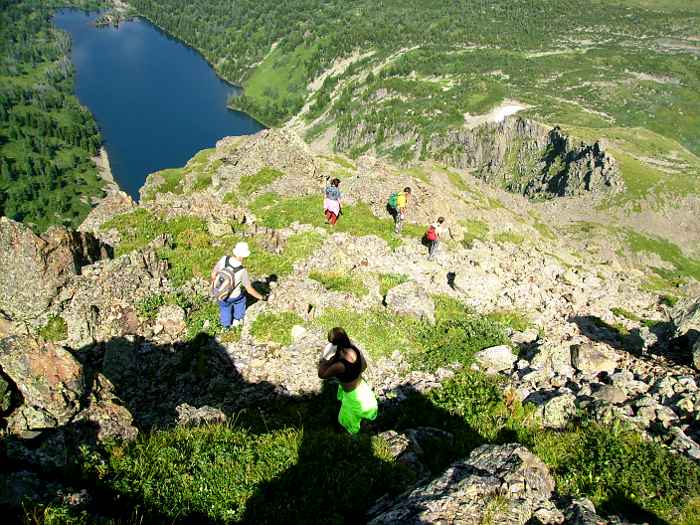 Сначала она идет мимо водопада, ко Второму и Третьему озерам путь занимает около часа, если не слишком отвлекаться на фотографирование цветов, водопадов, озер во всевозможных ракурсах и прочих красот. Берег Второго озера усыпан мелкими камешками разных оттенков красного цвета, возможно, объясняющего названия горы в слагающих ее породах много железа. Местные жители рассказывают, что во время гроз молнии ударяют именно в Красную гору. Однако встречается также много камешков зеленоватого оттенка, поэтому сама гора издалека вовсе не выглядит красной. Другая версия названия связана с обилием бадана, растущего по склонам горы, который весной во время цветения делает гору красной.
