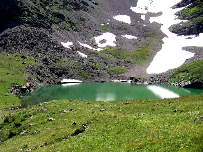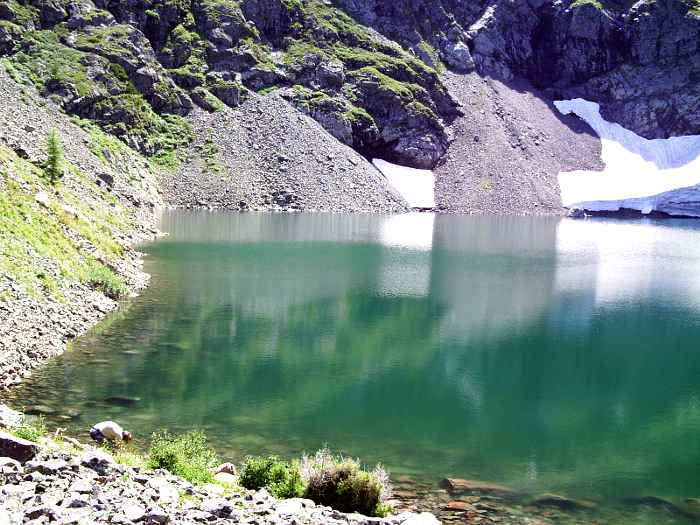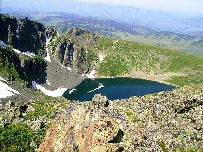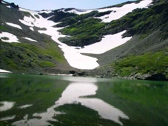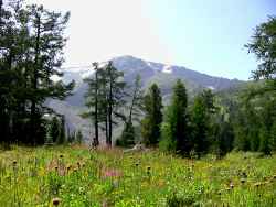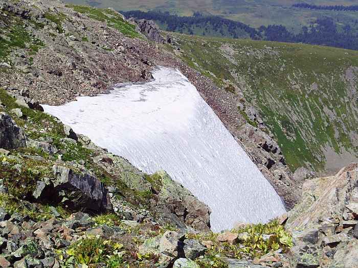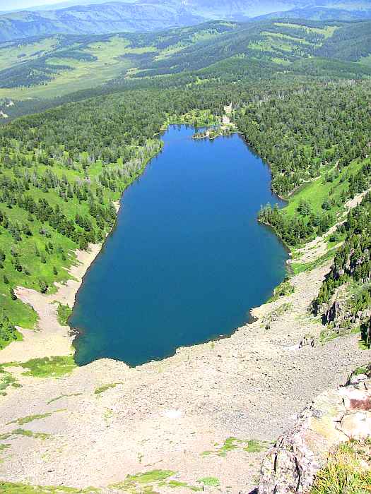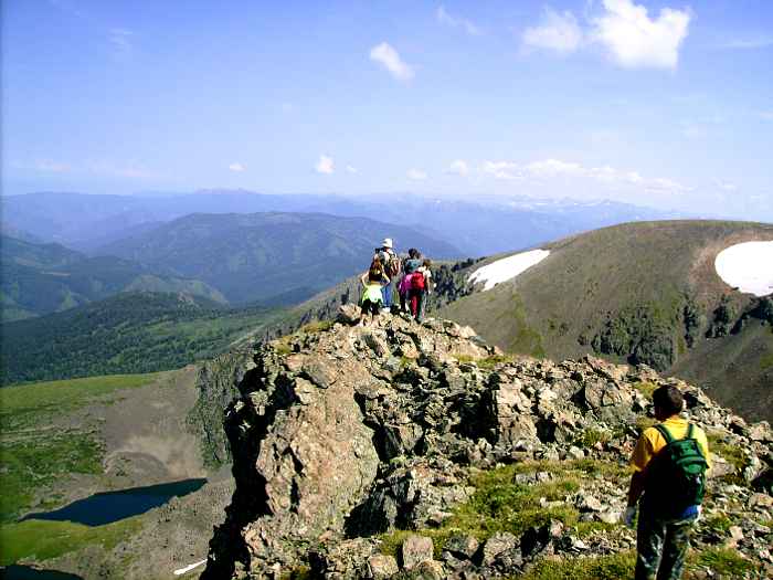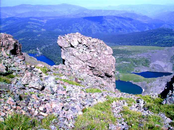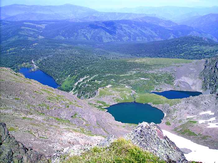 Третье озеро находится приблизительно на середине горы. От него за 1,5 ч можно взобраться на смотровую площадку на вершине г. Красная, откуда открывается панорама Уймонской долины, а в хорошую погоду можно увидеть красавицу Белуху. Это путешествие для туристов, имеющих более-менее хорошую физическую форму. Подъем по северо-восточному склону начинается справа от озера, тропа есть только до границы кустарника. Дальше по камням, придерживаясь направления и руководствуясь здравым смыслом. Подниматься нескучно каждый следующий участок пути слегка отличается по ландшафту от предыдущего, а панорама по мере подъема становится все более впечатляющей. Высота Красной горы ~2470 м, а вершина ее представляет собой обширное плато, при этом ее восточный склон, по которому можно подняться от Третьего озера, крутой, а на юг и на запад она полого понижается в долину реки Бирюкса. С большого скального выступа на восточной стороне горы видны все 3 озера потрясающе красивый вид. В северном направлении с края вершинного плато видно Четвертое озеро. На вершине Красной горы стоит видавший виды триангуляционный знак, свидетельствующий о некогда существовавшем геодезическом интересе к объекту. А еще с вершины можно делать прогнозы погоды на ближайшие пару суток если с юго-запада, со стороны Казахстана, показалась тучка быть ненастью.