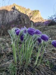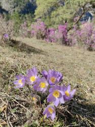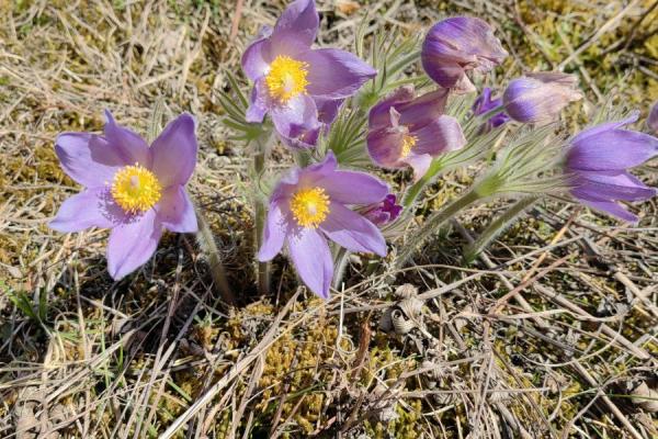 - Прострел раскрытый (Сон-трава) растение с прямостоячим, густо опушенным стеблем высотой до 20 см. Стеблевые листья в мутовке из мохнатых линейных сегментов образуют покрывало, которое защищает бутон от непогоды. Настоящие листья появляются позже и по форме сильно отличаются от стеблевых. Цветки светло-фиолетовые с желтой серединкой. Вначале они ширококолокольчатые, позднее звездчато-раскрытые диаметром до 8 см. Цветет в апреле мае до распускания листьев. В теплые сезоны возможно повторное цветение в сентябре. Неприхотлив, зимостоек.
