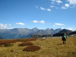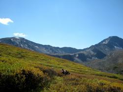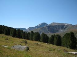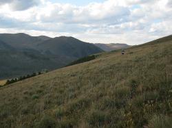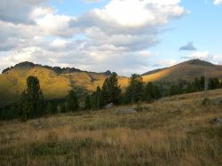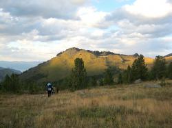 Путь от р. Акчан к озеру Кыргыз, правый край долины Сарыбель, тропа поднимается выше уровня леса