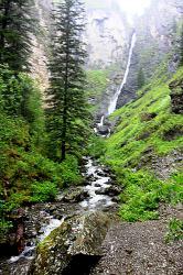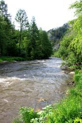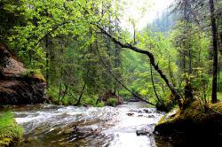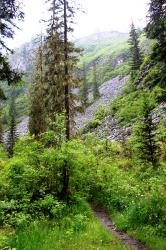 От стоянки до первого водопада 3 км. Как только мы отправились в путь начал накрапывать дождик. Дорога идет под сенью леса, многократно перебираясь с одного берега на другой, говорят здесь 14 бродов, мне кажется их гораздо больше. Я не обдуманно пошла в кроссовках, которые естественно через некоторое время устала снимать и топала уже в мокрых.