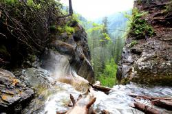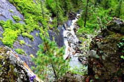 Идти минут 40-60 и вот из-за поворота появляется водопад «Жираф». Самый крупный водопад в Алтайском крае. Перепад высот составляет 72 метра. Мощный поток воды прорезает себе путь между скалами зрелище красивейшее.