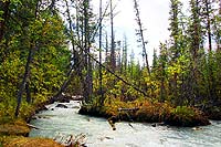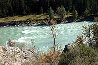 Дошли до Актру. Какой у нее ужасающий цвет, просто жуть. Какой-то грязно-желтый цвет. Еще не видел на Алтае такой грязной реки. И мощь тоже у нее отличная.
