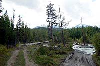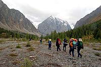 После обеда уже все небо затянуло. И примерно на половине пути между перевалкой и разливами на реке Актру пошел дождик. Пришлось доставать защиту от дождя и упаковывать спальник к себе в рюкзак. Совсем отстал от всех. Я подумал, что дождь теперь зарядит до самой ночи, но он скоро кончился.