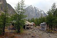 Между деревьями виднелись палатки и слышны разговоры людей. Даже в конце лета здесь много народу. Что совершенно не радовало, а наоборот. От памятников прошли немного далее и вправо в лес. Там надо будет пройти через старую открытую морену, словно каменная река, и там будет бивак. Костровище и скамейки возле него. Поставить там можно несколько палаток. не помню точно, но наверное часов в 18-19 пришли.
