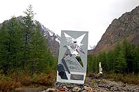 Вот и памятники показались, которые я тоже видел на фото ранее. Памятник на переднем плане это памятник сноубрдистам из Новосибирска, они на военном вертолете из Бердска прилетали сюда кататься. К сожалению им очень не повезло. Это было примерно в 2001-2002 году, я тогда про Алтай совсем ничего не знал, но про этот случай тогда слышал. Вот и я тоже добрался до этих мест.