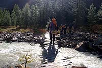Давай искать мостик, пошел вверх по течению, ничего нет. Тогда решили перейти приток на правый берег и идти вниз по течению. пришлось метров на 200 возвращаться назад. Скоро дошли до мостика через Актру. Это два бревна через мощное течение.