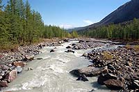 Толком дорогу из нас ни кто не знал. Сначала искали мост через Чую. Оказалось все очень просто. Надо просто ехать вверх по течению Чуи примерно 4 км. Там и будет мост. Возле моста встретили пару машин, они ехали с перевалки и остановились искупаться. Потрогал воду, примерно градусов 15-17, теплая. если бы не болел вчера, то искупаться бы захотел сильно, а так и не думал даже об этом.