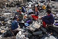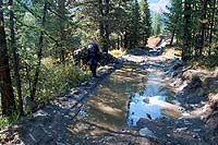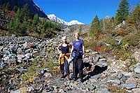 Здесь начинается подъем и тропа идет по старой морене. Тропа часто теряется, потом обнаруживается другая, потом опять теряется. Здесь много всяких троп, но все равно все ведут в одну сторону.