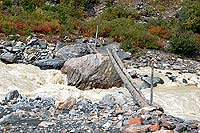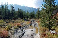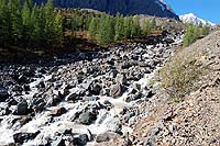 Назад пошли вдоль речки, которая стекая с ледника и впадает в Актру. Там где-то есть мостик, вот к нему нам и надо.
