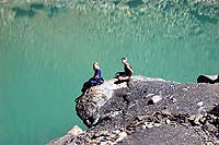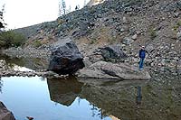Залез на морену и прошел немного и увидел озеро. Как раз посредине озера были. Вернулся назад за девчонками. Пока они лезли на морену, фотографировал.