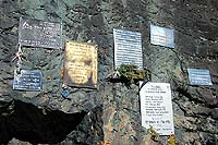 В районе мостика через Актру (дорога к леднику Малый Актру) обнаружили мемориальную стену со множеством табличек. Есть одна свежая прошлогодняя.