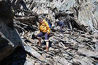 Решили спускаться в другом месте, не где поднимались, думали будет проще. Сначала было проще, но потом подошли к кулуару, очень крутому и очень камнеопасному. Отошли немного левее, и я решил, что надо спускаться здесь, чтобы не возвращаться к месту подъема.