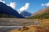 Спустились в долину и шли по старой морене. Кругом золото Алтая, красная карликовая березка, но еще не так много, вот в середине сентября будет совсем все здорово здесь.