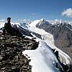 Народ оделся, связался и пошел на лед. А мы все выше и выше. Садились на камни и смотрели на красоты здешних гор. Стало хорошо видно ледник Большой Актру и саму вершину Актру 4044 м.