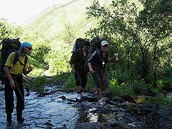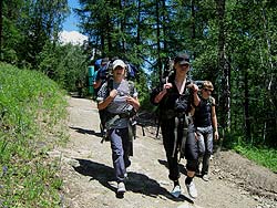 На собрании Дима еще раз акцентировал наше внимание на том, что необходимо держаться друг друга ближе в походах. Во-первых, потому, что взрослые люди несут ответственность. Во-вторых, на маршруте часто встречаются опасные участки, где необходимы внимание и взаимопомощь (на данном маршруте есть памятники, места гибели людей). В-третьих, легче идти всем рядом, даже если у каждого свой ритм ходьбы, своя физическая подготовка. Идущим в конце необходимо подгонять себя ради идущих впереди, чтоб не сбивать ритм движения группы. В течение дня всех медленней и самыми последними шли я и Михайлов Рома. Его оправдать можно, так как он помогал женщинам идущей за нами группы. Переносил им рюкзаки, подавал руку, показывал места перехода у водопадов. А меня стоило бы поругать, так как постоянно останавливалась, чтобы полюбоваться горными панорамами и от нападающей усталости. Но никто из ребят ни разу меня не упрекнул, предлагали помощь. Для того, чтобы ускорить общий шаг, ребята решили внести модернизацию. Они дали мне самый легкий рюкзак и сделали "лыжные" палки. После чего мне вновь стало легче идти. Даже на какое-то время я вырвалась вперед, но вскоре поняла, что идти последней комфортно. Во-первых, неловко постоянно чувствовать за спиной идущие шаги. Во-вторых, мне спокойней от мысли, что ребята идут впереди меня. В-третьих, идти последней — это гармонирует с моими физическими возможностями. Шла последней, но не отставая от группы. Идущие впереди ребята постоянно были в поле моего зрения. И так мы шли много-много часов, с утра до позднего вечера.