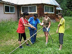 Немного, но все же, ребята помогли работникам базы. Наташа скосила траву на одной из лужаек. Мальчишки накололи и сложили поленницу дров. Это помогло ближе познакомиться и подружиться с работниками базы.