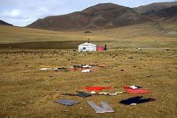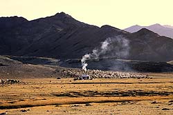 Еще до восхода солнца из юрты на том берегу ручья начал струиться дымок, воздух пропитан горьковатым ароматом степной маленькой травки. Всегда было интересно: кто научил поставить юрту именно здесь, как он выбирал место? Откуда пришло это знание? И ведь не всегда там есть родничок или дрова, и воду приходится носить издалека. Наверное, окружающий простор, нестрогие правила природной красоты подсказывают неграмотному арату, где ставить свое жилище. Ведь он будет наблюдать этот пейзаж день ото дня, в каждое время суток. Думаю, всё проще: рациональность, наложенная на красоту природы только это является здесь решающим фактором. Удивляют многочисленные стада, рассыпанные на склонах, что же они там щиплют? Травка очень маленькая, реденькая, почти чахлая. Дождей выпадает мало, зимой тоже снега немного, да и постоянно дующие ветра сушат землю. Неизбалованные травы высокогорья научились брать из почвы всё необходимое, и при внешней невзрачности заключают в себе колоссальные жизненные энергии. После водопоя, пастух, сопровождаемый собаками, поднимет стадо повыше в знакомую ему ложбину, где безветренно и животных согревают прямые лучи солнца.