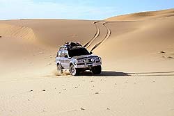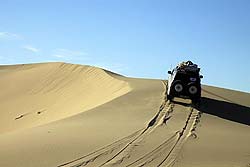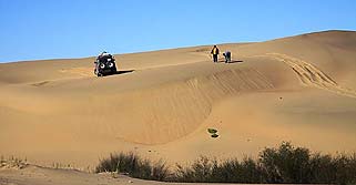 Застывшие песчаные волны, высотой в добрых два десятка метров впечатляют даже издали. Не скрывая своего уважения к этому чуду природы, начали осторожно пробовать первые переметы. К нашему удовольствию, машины уверенно двигались по песку, правда, пасуя на крутых подъемах. Нам оставалось только выбирать линию движения меж гребней песка и не сбавлять скорость в сомнительных местах. Удовольствие водителей от такого серфинга среди барханов трудно описать. Лишь увидев гладь озера, мы поняли, что барханы пересечены и нас впереди ждет гора Сутай.