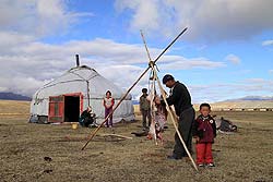 Из соображений гармонии и внутреннего ощущения потребности в солнце, юрты ставят входом на юг. Радость бытия, солнечный свет приходит через вход в жилище. Интерьер кочевого дома очень прост, но каждая вещь тут имеет свое раз и навсегда установленное место. Печь в юрте всегда по центру, здесь тепло и огонь. В левом углу от входа лежит седло, а на стенке висят камча, с отполированной ладонями рукояткой и конская сбруя, украшенная самым настоящим потемневшим серебром, старенькая винтовка это мужская сторона юрты. Правая (восточная) сторона – женская: полки с посудой и шкафчик с продовольствием, ведра для дойки скота и прочие предметы, связанные с женским трудом в скотоводстве. Внутренняя гармония жилища кочевника независима от внешней суеты современного мира.