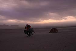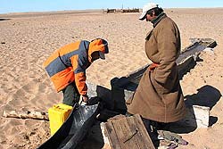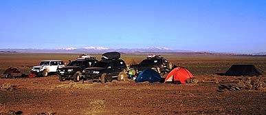 В Баян-Ульгие к нам присоединился четвертый экипаж из трех монголов сотрудников компании-туроператора «Mongolia Expeditions». Чтобы два раза не вставать, скажу сразу вклад наших монгольских друзей в успех экспедиции трудно переоценить. Как бы мы выкручивались без них в поисках топлива для автомашин, я не представляю! Вечером россияне мучили их вопросами о настоящем и прошлом Монголии и слушали их, открыв рты. И пусть мне будет стыдно, но именно наши монголы приучили нас собирать все окурочки в лагере.