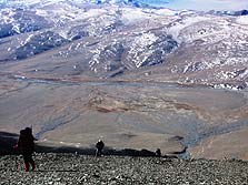 Казалось бы, зачем нужно это восхождение? У нас автомобильный маршрут, катись себе по монгольскому бездорожью, вытряхивай себе душу и внутренности… Но спортивная составляющая нашего маршрута, логика спортивного туризма не могла допустить игнорирования того факта, что мы были вблизи самого южного четырехтысячника Монголии, и только посмотрели на него… Рано утром еще до рассвета, машины подвезли группу восхождения к подножью. Это издали вершина кажется простоватой и доступной. Подъехав ближе и выйдя на склоны перегиба, начинаешь понимать, что просто так эта гора совсем не намерена сдаваться. Склон был крут, воздух очень сухой, отчего першит в горле, даже ненадолго появились признаки горной болезни. Но панорама гор была великолепна, а погода замечательна и восхождение на вершину Сутай (4090 м) прошло без сюрпризов. За один день подняться на четыре тысячи метров и спуститься в базовый лагерь до ужина так возможно только в Монголии!