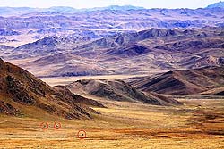 Большой резонанс в сознании происходит, когда после двух-трех дней блужданий по высокогорной пустыне, наши машины начинают проваливаться в глубокое ущелье. Большинство равнинной Монголии находится на плато 2000 метров, это быстро забывается… и вдруг ухаем вниз! Разлом в горах, как земля Санникова все полчаса дорога круто спускается куда-то в неизвестность. Смотрю на альтиметр потеряли за полчаса почти километр в высоте! И сразу другая погода, другие птицы в небе, другая жизнь. Здесь в межгорной степи мы уже можем рассчитывать на «блага» цивилизации в виде селений и топлива для машин.