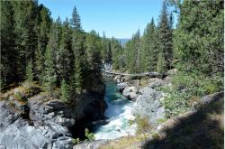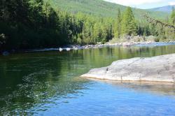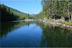 В месте нашей стоянки ширина реки около 50-ти метров. Вода до того прозрачная и чистая, что можно отчетливо видеть дно на глубине 5-6 метров. Кроме того, достаточно теплая, можно легко окунуться и получить наслаждение от водных процедур. Перемещаться по берегу вдоль реки имеет смысл только вниз по течению, поднимаясь вверх, найти спуск к реке почти невозможно.