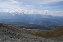 После рудника начинается подъем к ретранслятору. Дорога не для слабонервных, реально страшно, адреналин вырабатывается ведрами… Далеко не каждая машинка осилит этот путь. Иногда кажется, что угол подъема 90 градусов, а с боку ущелье с вертикальной стеной, дна которого не видно. Все страхи с лихвой оправдываются видами, открывающимися с горы. Северо-Чуйский хребет как на ладони, за ним даже можно разглядеть Белуху, до которой по прямой около 100 км.