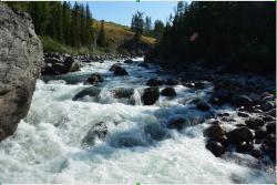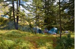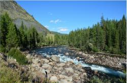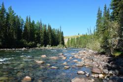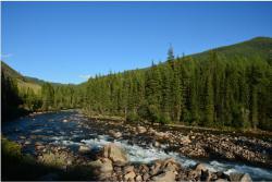 Я перешел на другой берег, навстречу вышел Сергей. Простой, приветливый парень. На вопрос «не будет ли у нас проблем с посещением заповедника без разрешительных документов» ответил: «Разберемся…». Он нас и проводил к месту будущей стоянки. Справа, в объезд территории кордона, идет дорога к берегу Чулышмана. Примерно километра 3. Съехать к самому берегу невозможно. От него отделяет достаточно крутой склон, длина спуска около 10 метров. Поэтому машины оставили на верху, а к реке спустились пешком и перенесли весь скарб для лагеря. Прямо у берега шикарная большая поляна, окруженная величественными лиственницами, отличный подход к воде. Сразу видно, что мы на этой поляне далеко не первые. Не в плане, что мусор (там очень чисто): притоптана трава, оборудовано место для костра с бревнами вокруг, на берегу простенькая банька четыре вертикально вкопанных столбика, обтянутые плотной