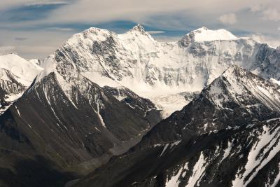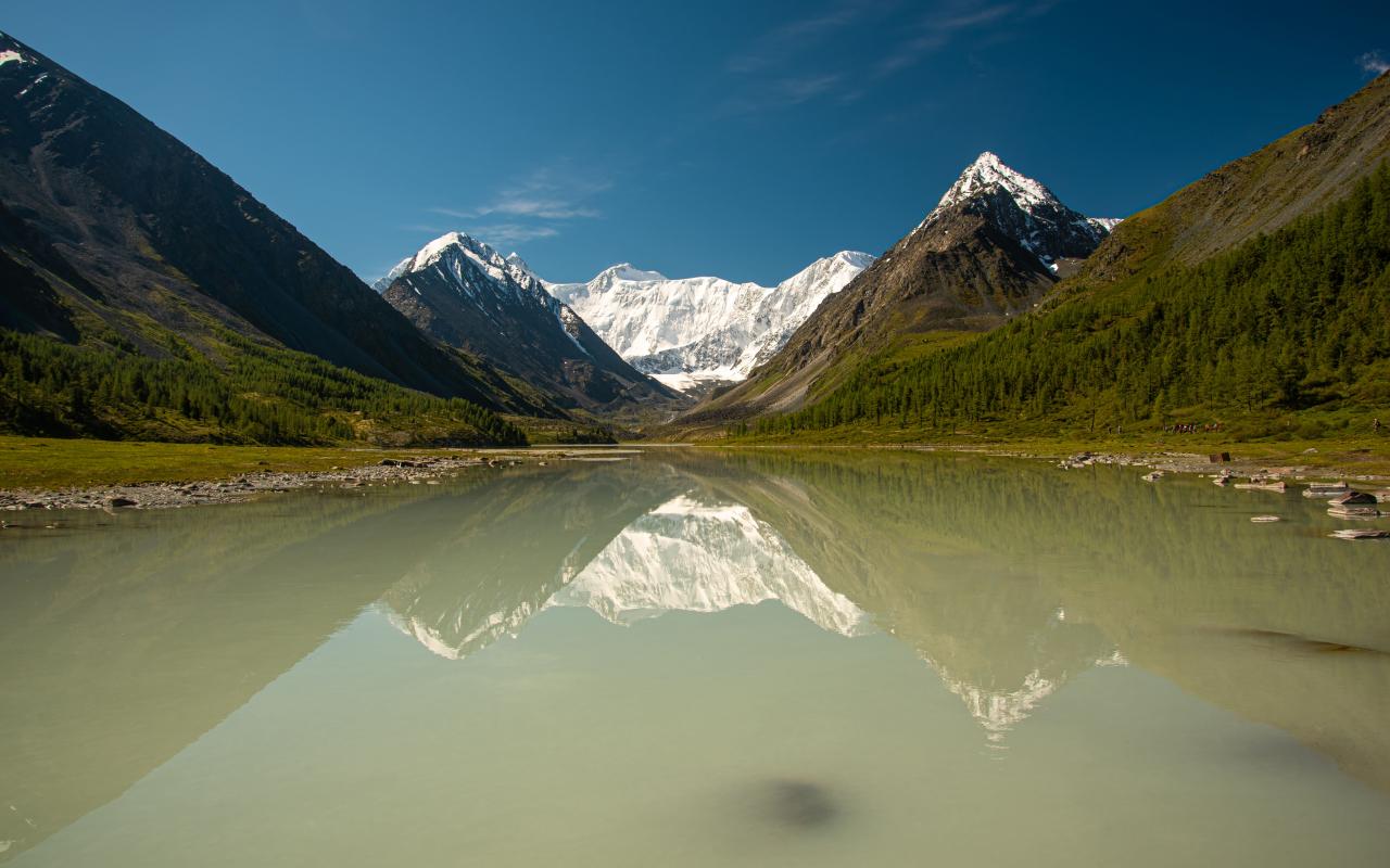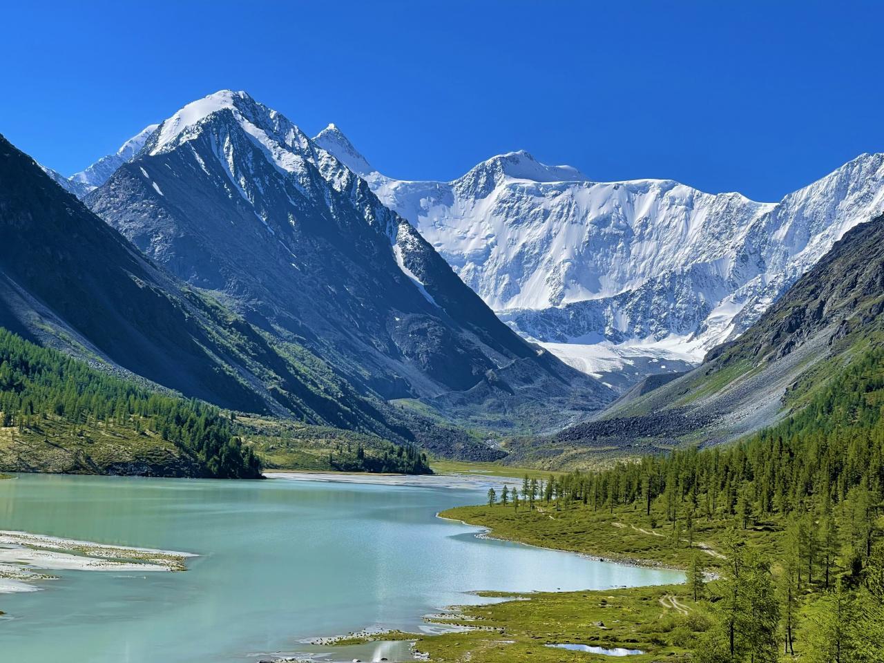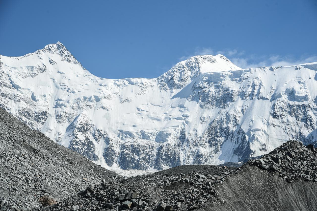 С ледника открывается шикарный вид на белоснежную Аккемскую стену и 2 вершины Белухи.