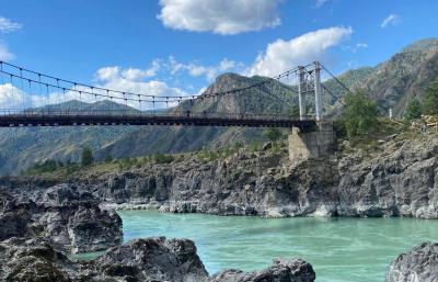 ОРОКТОЙСКОГО МОСТА над ущельем, где между скал зажата река КАТУНЬ и здесь ее самое глубокое место – более 70 метров!!!