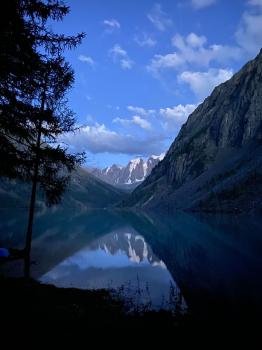 Тропа поднимается к Нижнему Шавлинскому озеру. Отсюда открывается прекрасный вид на три вершины горного узла – Мечту, Красавицу и Сказку. В ясную безветренную погоду они полностью отражаются в огромном зеркале озера и это поистине сказочное зрелище! Ужин на костре, ночь в палатках.