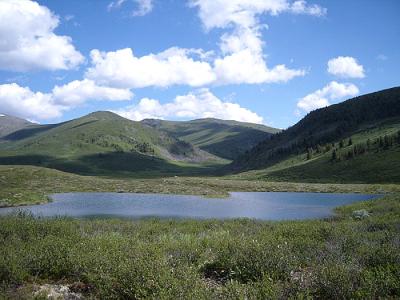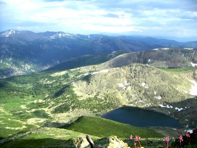 Внизу зеленеет долина Кызыл-Гак. Этот огромный альпийский луг под перевалом тоже всегда в цвету. Особенно яркими красками горят сплошным цветочным ковром в конце июня огоньки. Спускаемся в долину и уходим по Куминскому хребту до стоянки в верховьях речки Аюла.