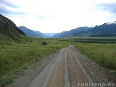 Выезжаем из лагеря и едем в сторону Катуни, поворачиваем вниз по течению реки. Здесь можно чуть-чуть подняться по заброшенной дороге на пологий склон урочища Тельдекмень, чтобы увидеть панораму долины реки Катунь в обе стороны.