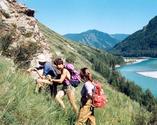 Можно пройти вдоль по левому берегу Чарыша. Идёшь то по тропе, то по дороге, то по совсем неприметной тропинке. С одной стороны – река, с другой – горы, так что не заблудишься. Единственное серьёзное препятствие – одна из речек, притоков Чарыша. Если ничего не путаю, это, если считать от Сентелека, – второй по счёту приток (до первого притока от Сентелека идёт дорога, по которой регулярно ездят машины).